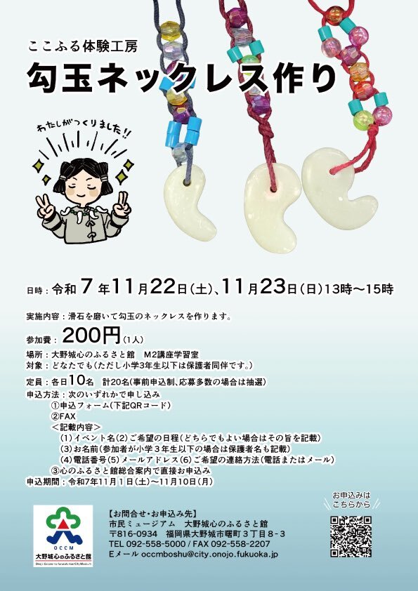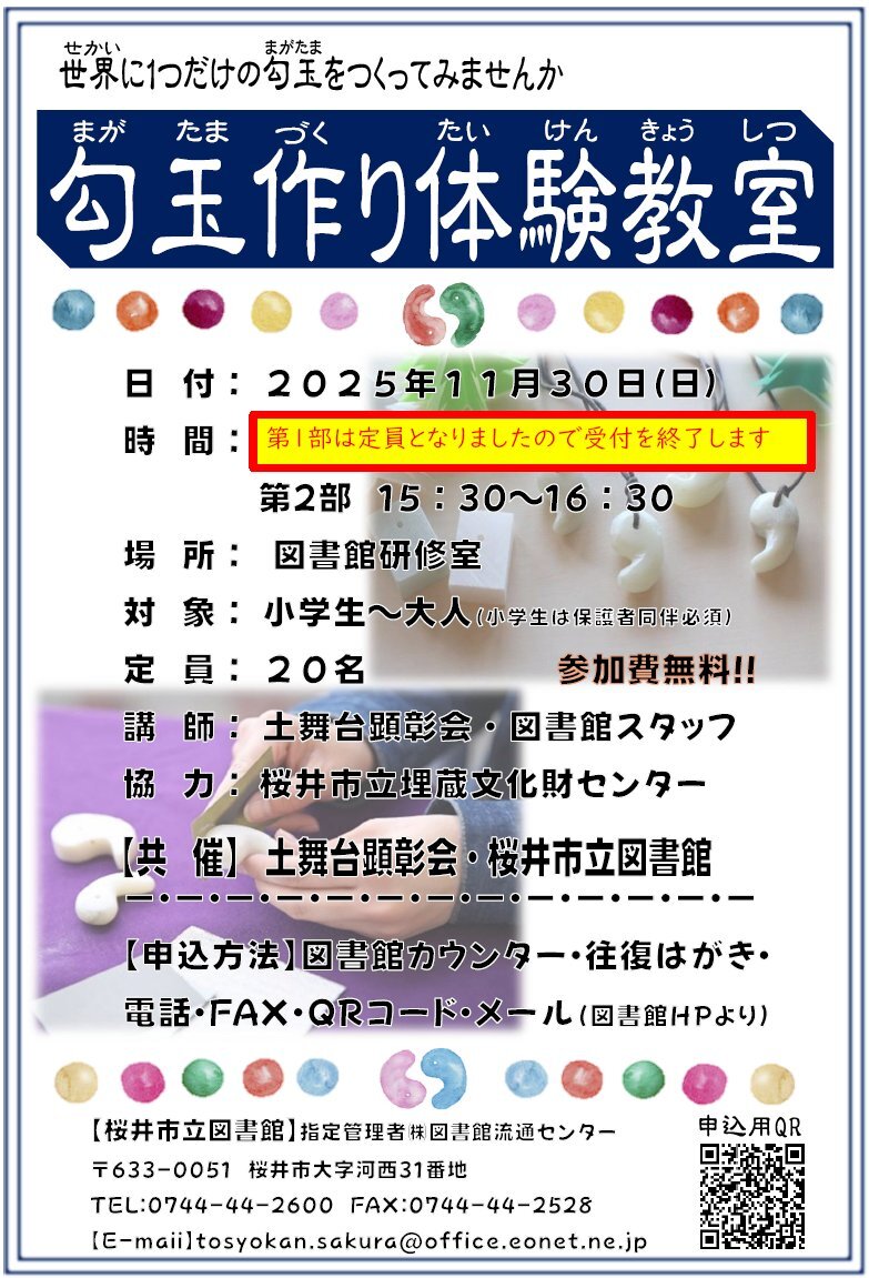 参加募集しております2025年11月30日(日)土舞台顕彰会と図書館の共催イベント「勾玉作り体験教室」は、第1部が定員となりましたので、受付を終了します。第2部はまだ受付できます!お申し込みは下記URL又は図書館まで。forms.gle/hkGtt74WKLtfgq… #桜井市立図書館 #土舞台顕彰会 #勾玉 pic.x.com/78gdlYvqU0