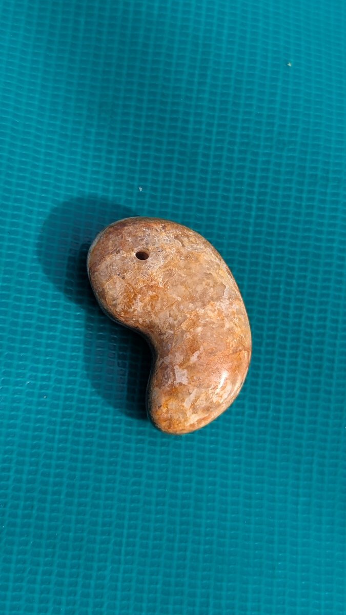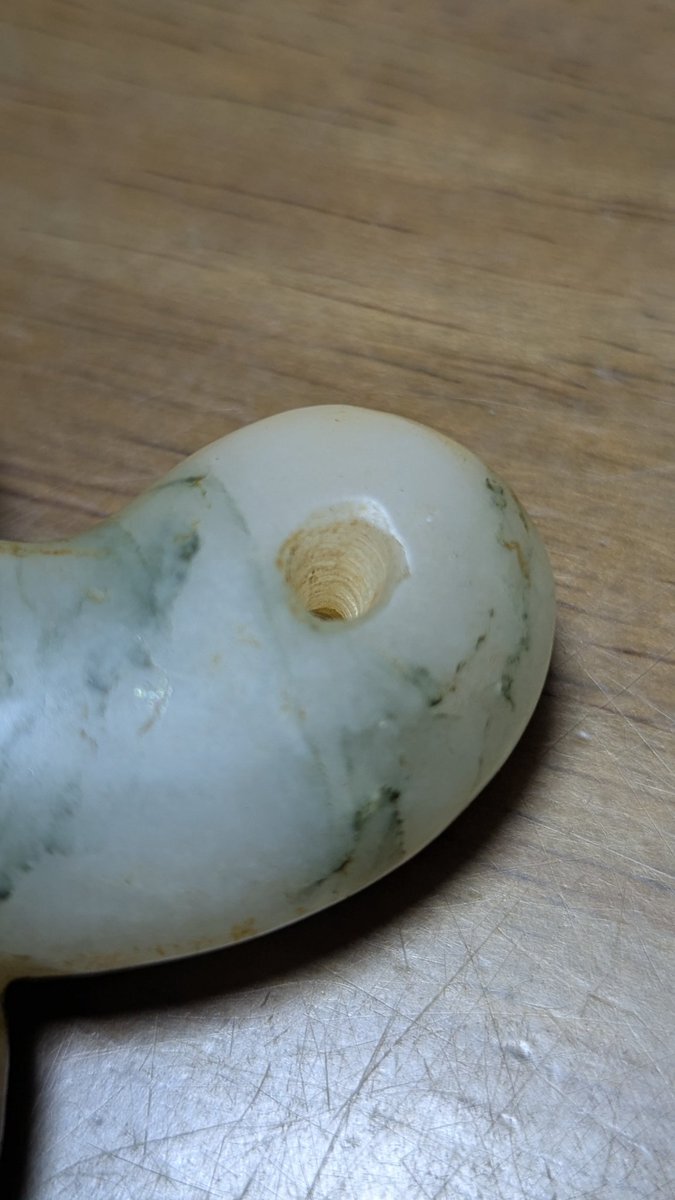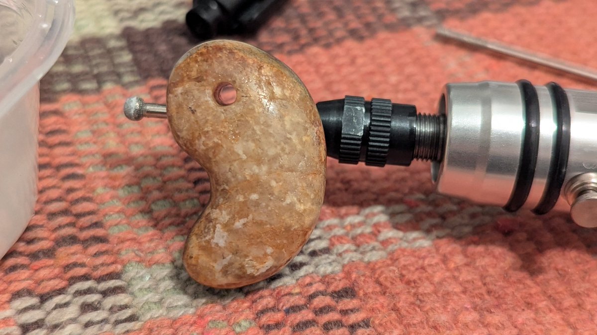 以前、浜で拾ったオレンジ色の石で、勾玉づくり。ペーパーで2000番まで磨いて、ダイソーのルーターで穴を開けたけど、ビットが負けたのか、半分から先が削れない。 #勾玉 pic.x.com/Nxy9LXoPdR