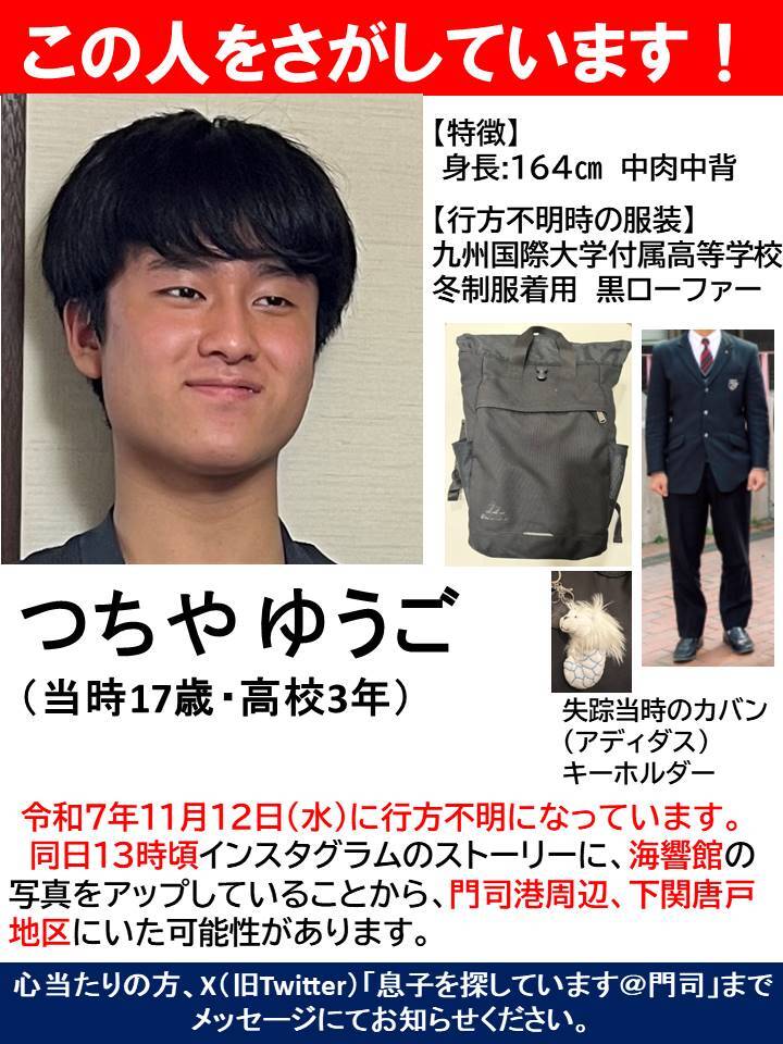 高校生の息子が行方不明になりました。 11月12日(水)13時頃、北九州市門司港~下関市唐戸地区(海響館)周辺にいたようですが、帰ってきません。 情報がありましたら、些細なものでもかまいませんので、メッセージまでお願いします。 #行方不明 #門司港 #海響館