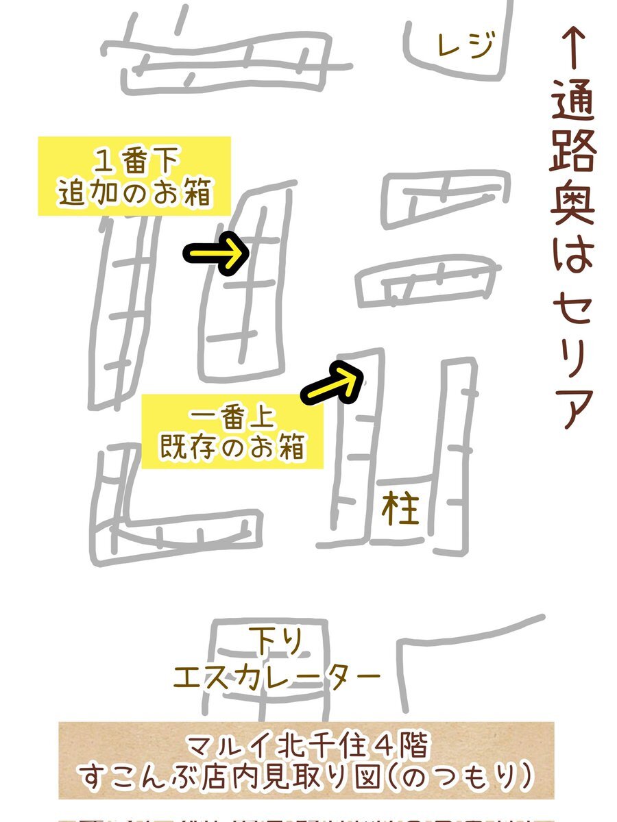 #すこんぶ北千住マルイ店 さんに 一番下のお箱を追加したよ✨️ 揺れるピアスとイヤリングを置いてるよ。 場所は2枚目の画像に。 即席で描いたので画力は問わないでね(笑) #北千住 #すこんぶ #北千住マルイ #ハンドメイド好き #ハンドメイドアクセサリー #ムギのアクセサリー #PetitMugi #プチムギ pic.x.com/y8yQnnzoxU