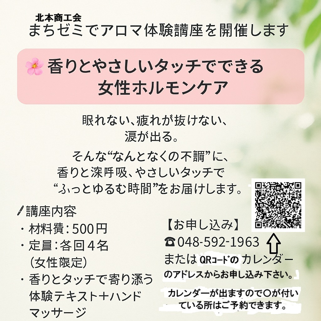 🌸まちゼミでアロマ体験講座🌿 香りとやさしいタッチで女性ホルモンケア 1/6〜17開催・材料費500円・女性限定 📩申込:utage-system.com/event/AmVy78On… #北本市 #まちゼミ #アロマ体験 #セルフケア pic.x.com/4Pk4hrCFK3