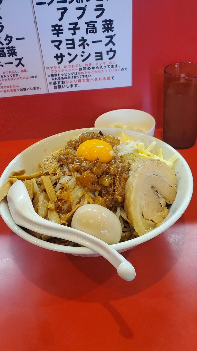 豚ゆう 北本市 まぜそば(たぶん並+ネギ、味玉、メンマTP) もう言うまでもない至高の一品。豚増やしたいし麺増ししたいけど、、、我慢! 何度でも来るさ! #豚ゆう #ラーメン #まぜそば #二郎系 #北本市 pic.x.com/Xl500a2i6u