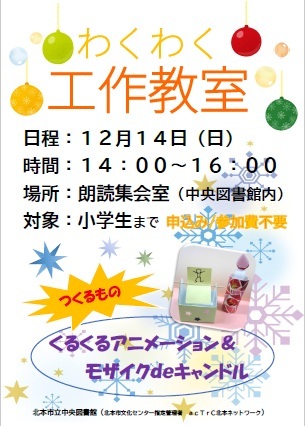 【#中央図書館】 わくわく工作教室、 12月14日(日)開催! 「くるくるアニメーション」と「モザイクdeキャンドル」を作ります。 冬のおうち時間にピッタリな工作です。 場所:中央図書館 時間:14:00~16:00 対象:小学生まで お申込みは不要。ご参加お待ちしています😊 #北本市立図書館 #北本市