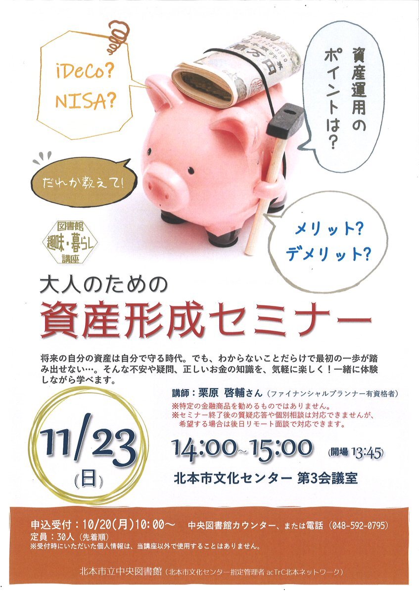 #中央図書館】まだ受付できます! 「大人のための #資産形成 セミナー」 #資産管理 に興味はあるけどよくわからない… という方はぜひ! お問い合わせは、中央図書館カウンターまたは電話(048-592-0795) #北本市立図書館 #北本市 #資産運用 #お金の知識 pic.x.com/lfnGeGKtVo