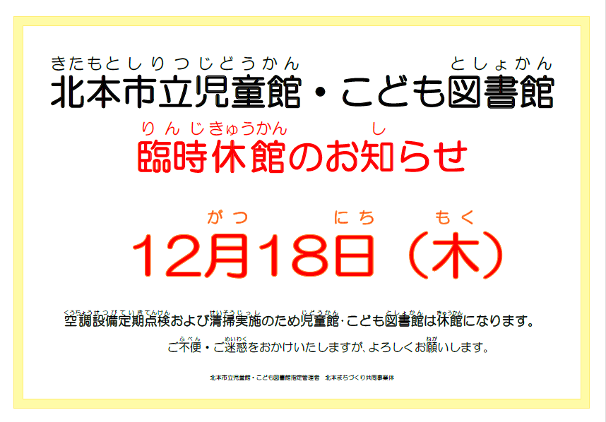 #こども図書館 #休館】 12月18日(木)こども図書館は設備点検のため休館となります。 ご不便をおかけしますが、ご理解・ご協力をお願いいたします。 #北本市立図書館 #北本市 pic.x.com/0VjTGkvLJw