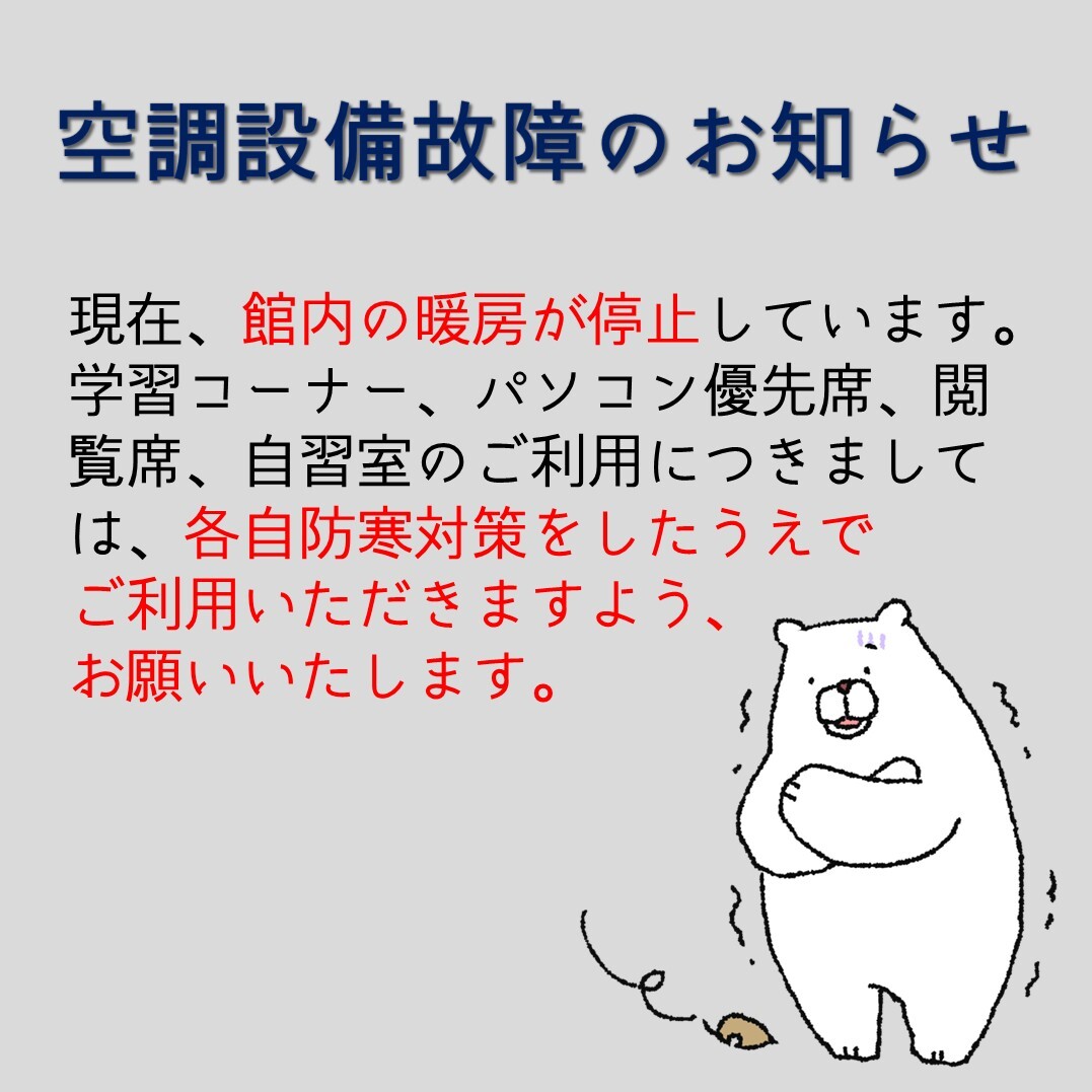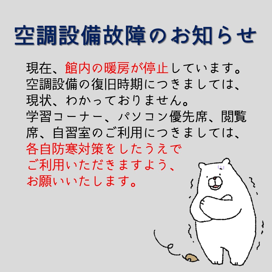 #中央図書館】ご来館の皆さまへ 空調設備の故障により、中央図書館、および #文化センター 内の暖房運転ができなくなりました。 修理手配中ですが、現在復旧の目途は立っておりません。 皆さまにはご不便をおかけいたしますが、ご理解・ご協力をお願いいたします。 #北本市立図書館 #北本市 pic.x.com/5F74QCRUOt