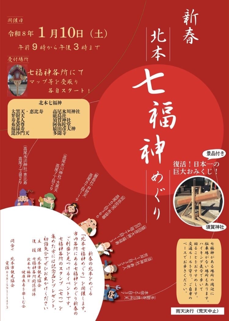 【北本七福神めぐり】 令和8年1月10日(土)9時〜15時、 北本市内の七福神をまつる寺社で、北本七福神めぐりを開催。 七福神をめぐるスタンプラリーも実施。 日本一大きなおみくじも復活します。 #埼玉県 #北本市 #七福神 pic.x.com/o4G6TDq0qz