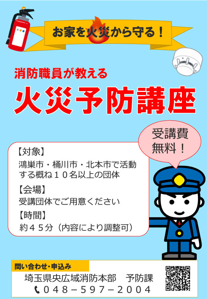 【秋の全国火災予防運動実施中】 火災が増える時季に備えて火災予防講座を受けてみませんか?詳しくは #埼玉県央広域消防本部 ホームページをご覧ください ken-o.or.jp/prepare/firepr… #予防課 #火災予防講座 #鴻巣市 #桶川市 #北本市 #住宅防火 pic.x.com/wldRuftiDd