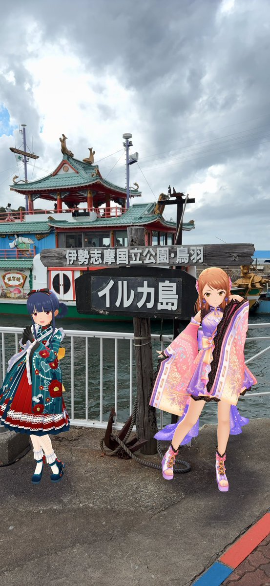 鳥羽のイルカ島で雪美ちゃんと一緒にパシャッ♪ 龍宮城って…海の上に浮かんでたんだ…ね? #北条加蓮の煌めく9時5分 #北条加蓮 #佐城雪美 #デレステAR #デレスポAR pic.x.com/xJC6WiYioP