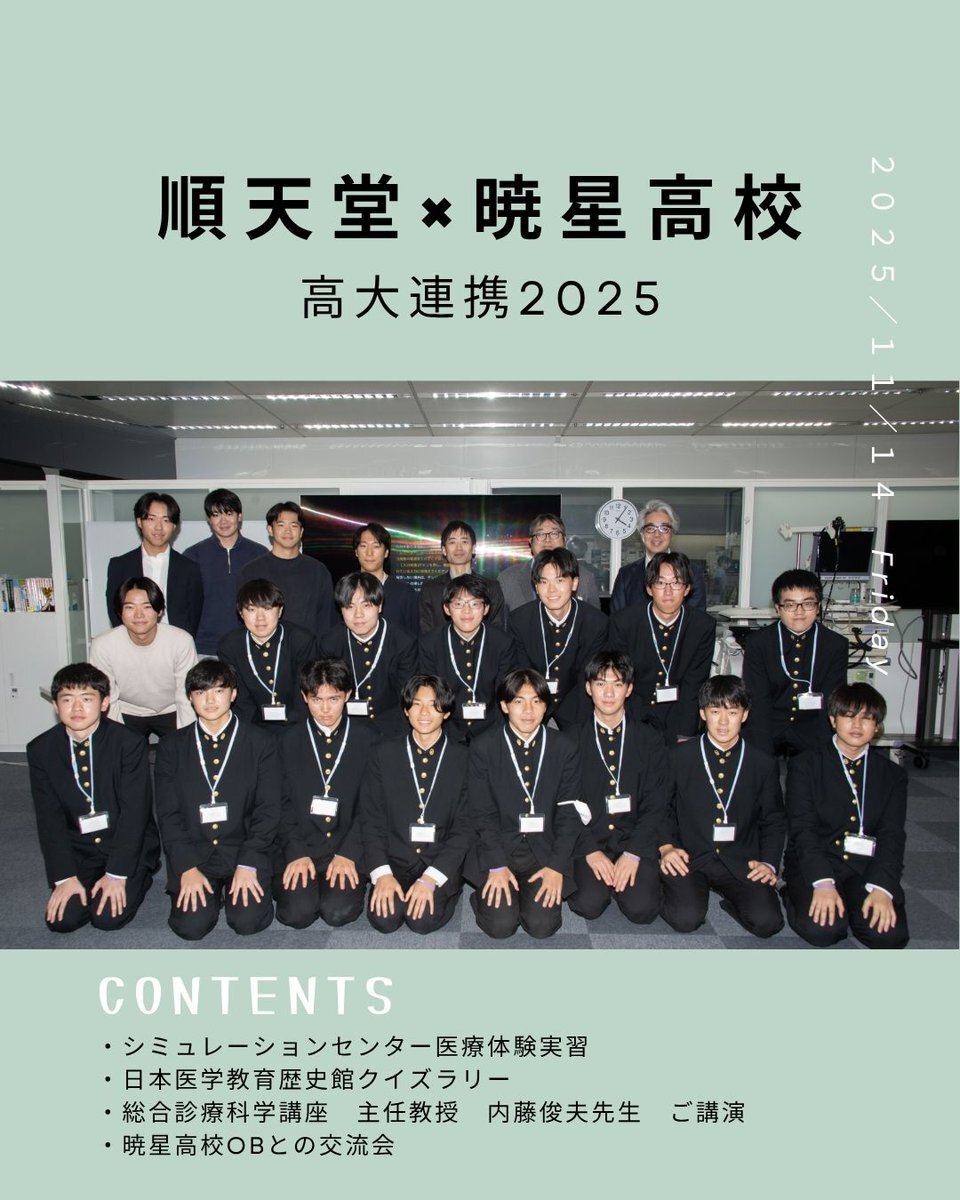 2025.11.14 Fri. 順天堂×暁星高校 高大連携! 今回は暁星高校の皆さんが高大連携事業のため本郷まで来てくれました。暁星高校の生徒の皆さんはとても和気あいあいとして、とても楽しい高大連携となりました。 #順天堂 #順天堂大学 #医学部 #医学部受験 #高大連携 pic.x.com/wDbAvray1U