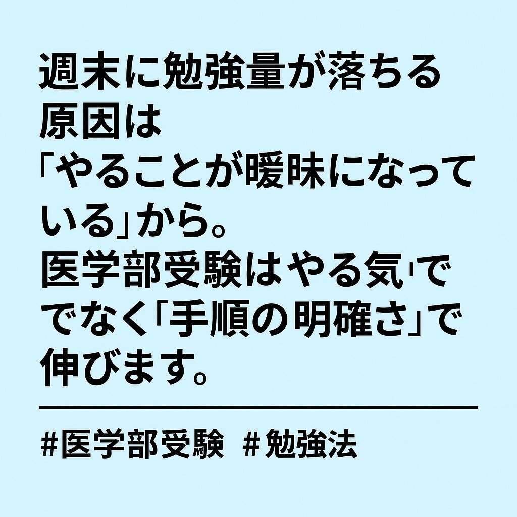 週末に勉強量が落ちる原因は 「やることが曖昧になっている」から。 医学部受験は“やる気”ではなく “手順の明確さ”で伸びます。 #医学部受験 #勉強法