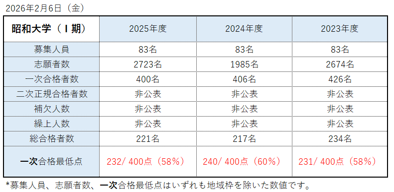 2026年2月6日(金) 昭和医科大学(Ⅰ期) ・公募推薦の新設等に伴い、一般の定員は減っています。 ・「7割獲れれば確実に通る」と小風医学部長は仰っています。 ・合格者の平均偏差値65.7(全統) #医学部 #過去3年分データ pic.x.com/xSts60DHzL