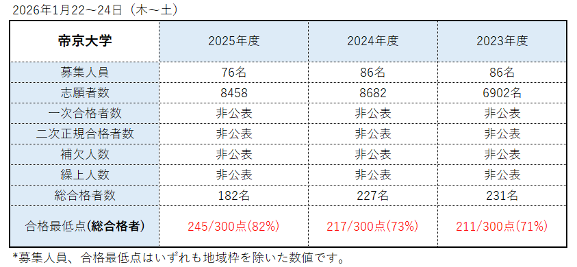 2026年1月22~24日(木~日) 帝京大学 ・昨年度から総合型入試が始まり、一般入試の定員が10名減っています。 ・総合格者は200名を切っており、狭き門になっています。 ・合格者の平均偏差値63.3(全統) #医学部 #2026年度一般入試 #過去3年分データ pic.x.com/UCE0cNCBf0