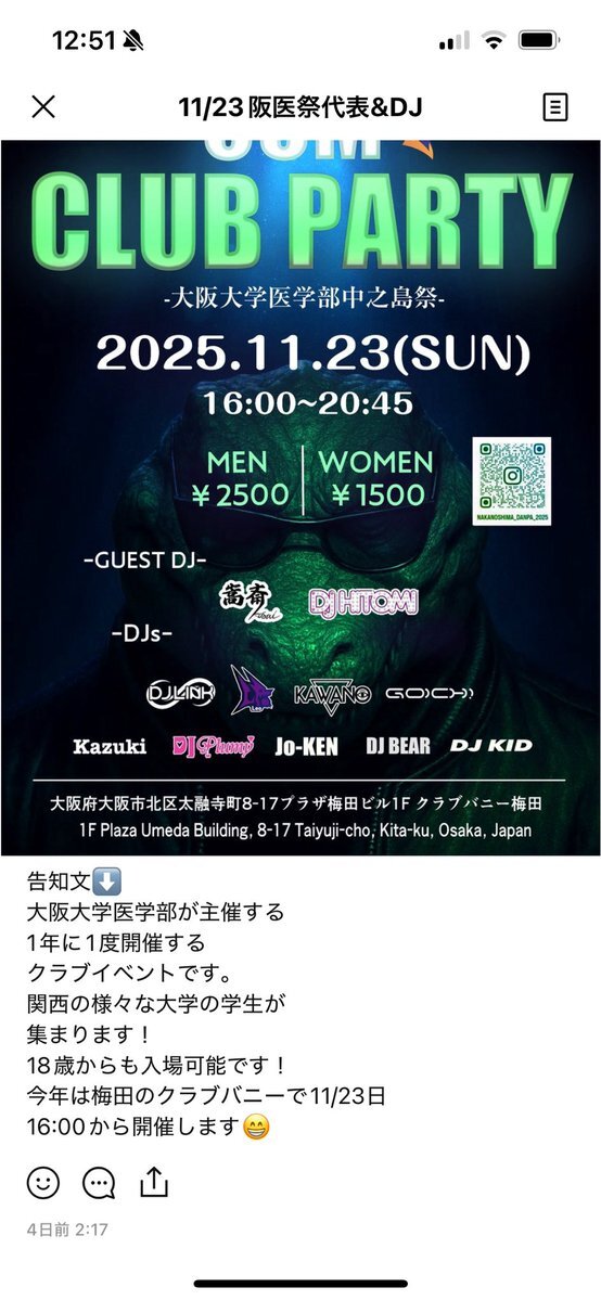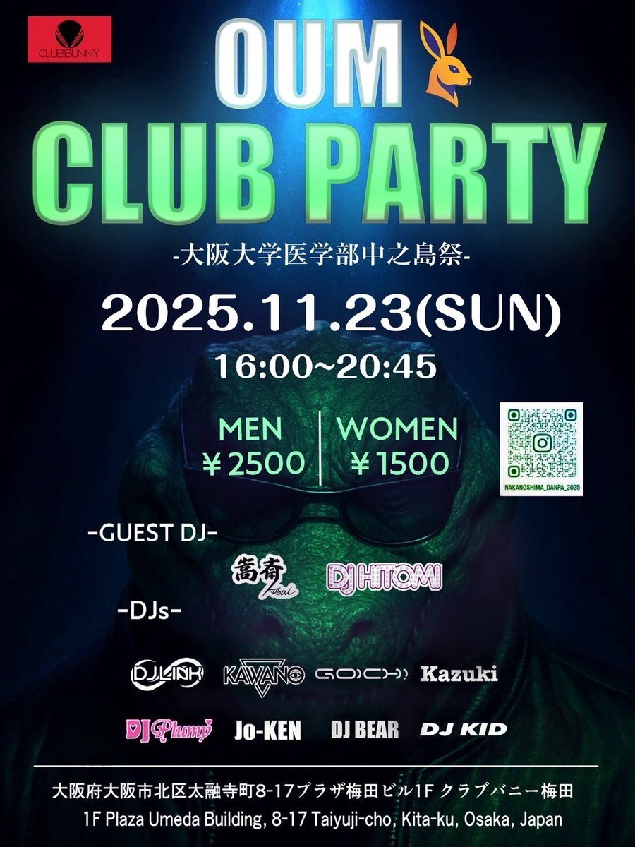 明日は大阪大学医学部主催のダンスパーティーでDJするので是非遊びに来てください✨予約受付中です💖 私は17時からDJします✨ 梅田のクラブバニーでお待ちしてます🐰💖 #大阪大学 #医学部 #ダンスパーティー #阪医祭 #中之島祭 #dj #梅田 #バニー #クラブイベント pic.x.com/vv1FjVm0x3