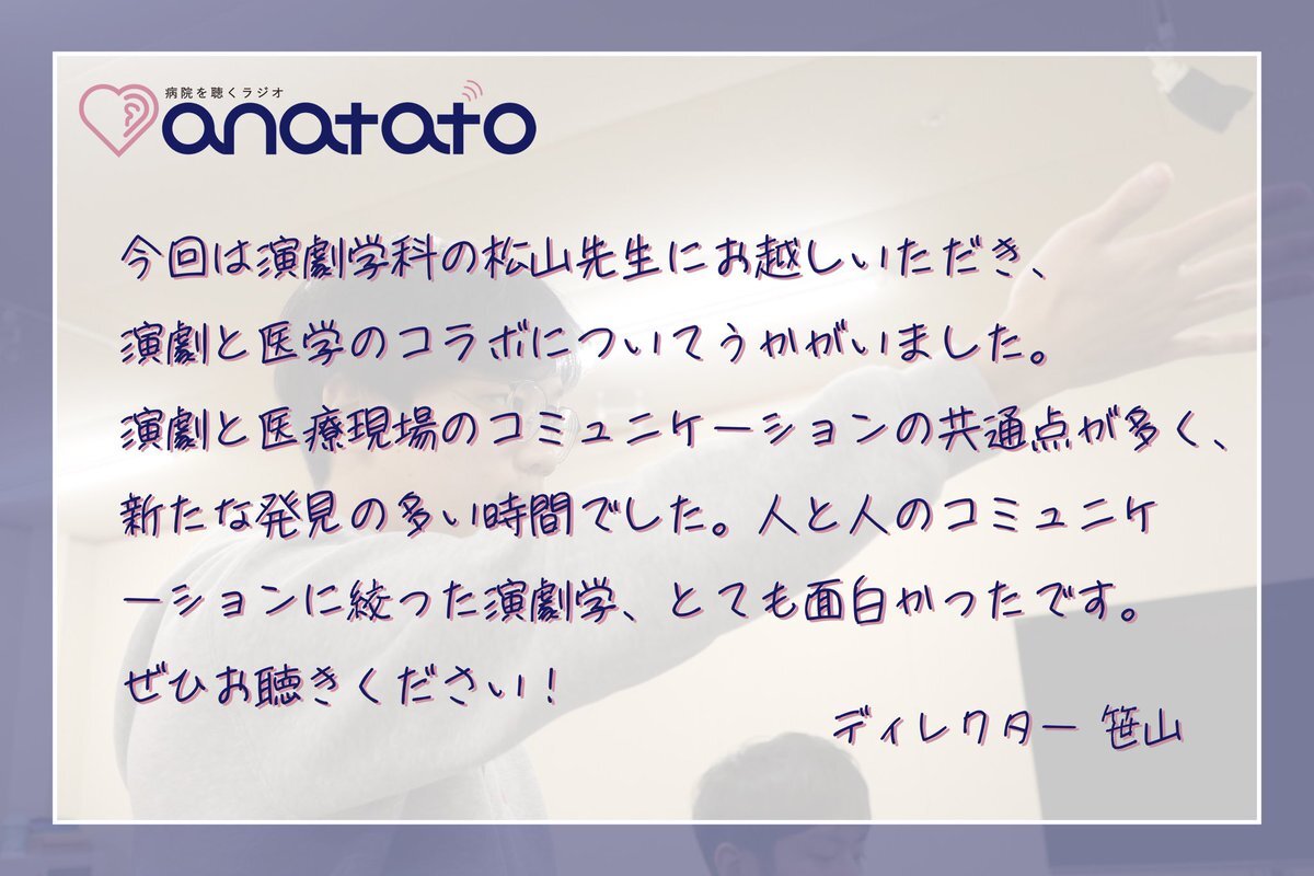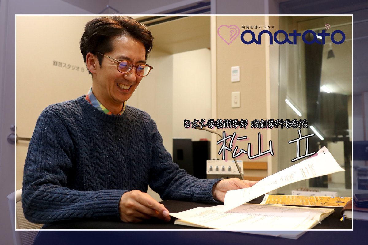 いつもと趣向を変え、日本大学芸術学部 演劇学科 准教授の松山立先生をお迎えしました ❄️ 「芸術と医療」。まったく違うようでつながっている二つの分野から、コミュニケーションの本質を考えます! youtu.be/zgBN-x1WStU?si… #病院を聴くラジオ #anatato #日本大学 #医学部 #芸術学部 #日大板橋病院 pic.x.com/4ecfXrYa2R