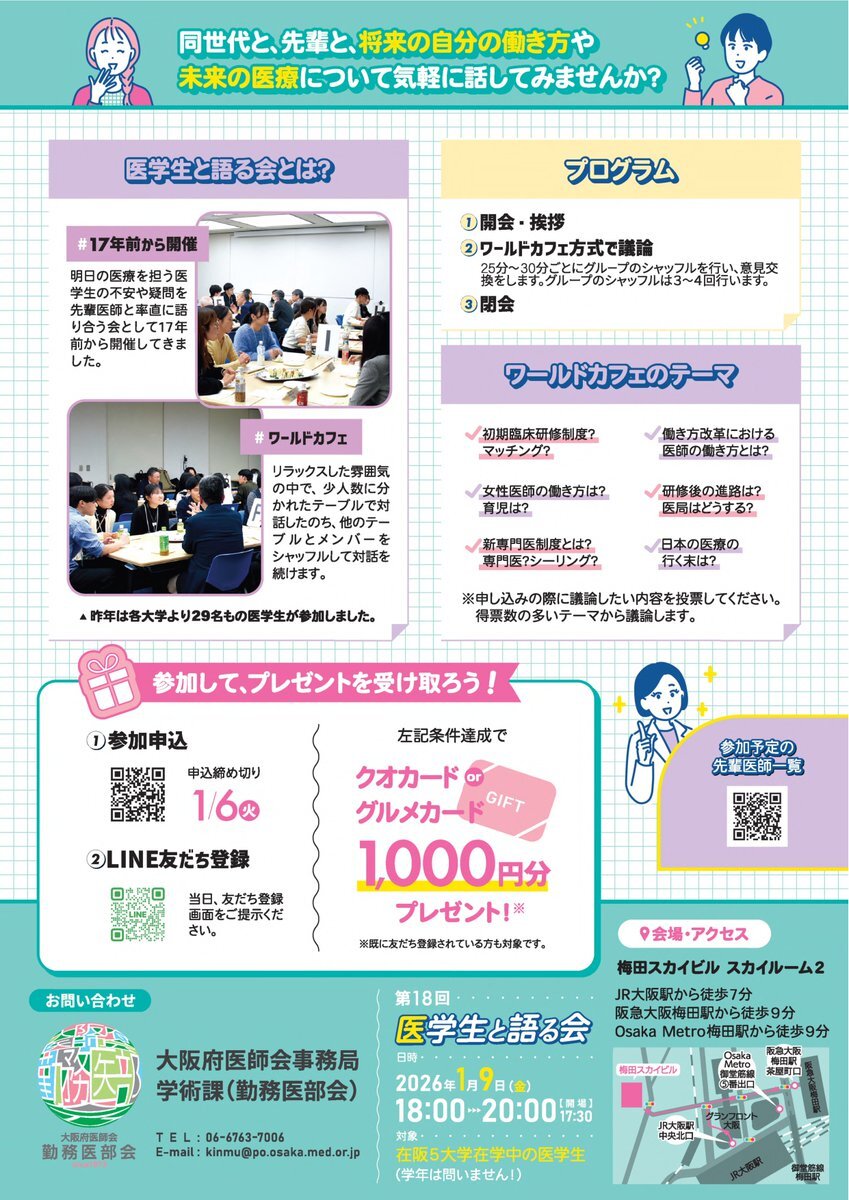 大阪の医学生のみなさん!😊 先輩医師とフランクに話せる「医学生と語る会」参加者募集中! 日時:2026年1月9日(金) 場所:梅田スカイビル 形式:#ワールドカフェ(少人数で気軽に話せます) 昨年は府内5大学29名が参加してるで~🥰 詳細・申込はこちら👇 osaka.med.or.jp/documents/inde… #医学生 #医学部 pic.x.com/ZzkJIwHBqA
