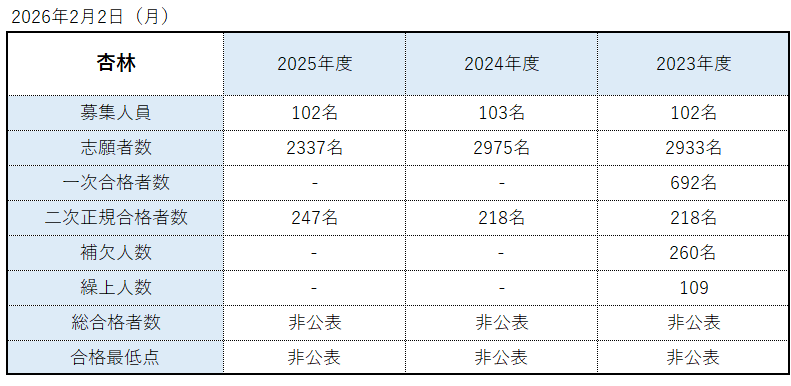 2026年2月2日(月) 杏林大学 ・2025年度は帝京と日程が重なり志願者大幅減でした。2026は4校が重なっており、実質倍率はやや低くなりそうです。 ・一般入試で定員100名を超えるのは杏林の他に国際医療、慈恵しかありません。枠は大きいと言えます。 #医学部 #2025年度一般入試 #過去3年データ pic.x.com/poLNR2LUDv