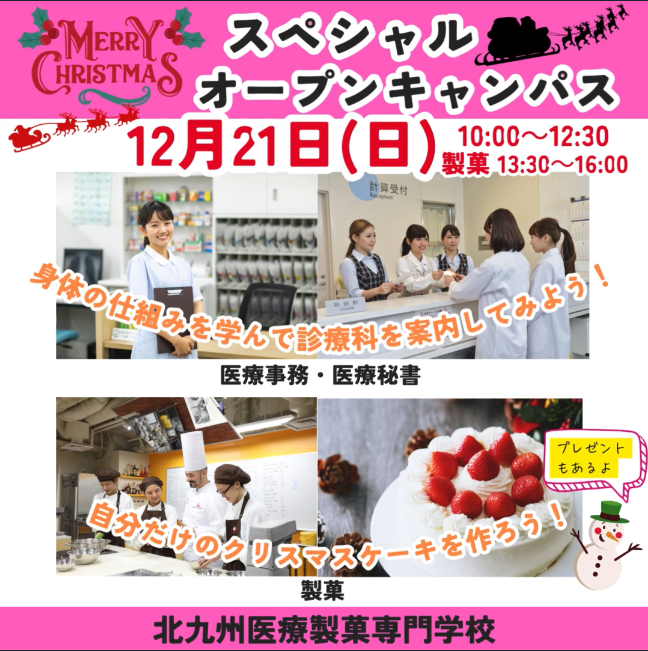 🎅🎁 12月21日(日)はクリスマスオープンキャンパス!クリスマス限定のスペシャル体験メニューを開催✨ #専門学校 #医療事務 #製菓 #製パン #カフェ #福岡県 #北九州 #小倉 #大原 #オープンキャンパス #進路相談 #体験授業 #クリスマスイベント #体験入学 #スペシャルメニュー #クリスマスプレゼント pic.x.com/BFE8rru7wE