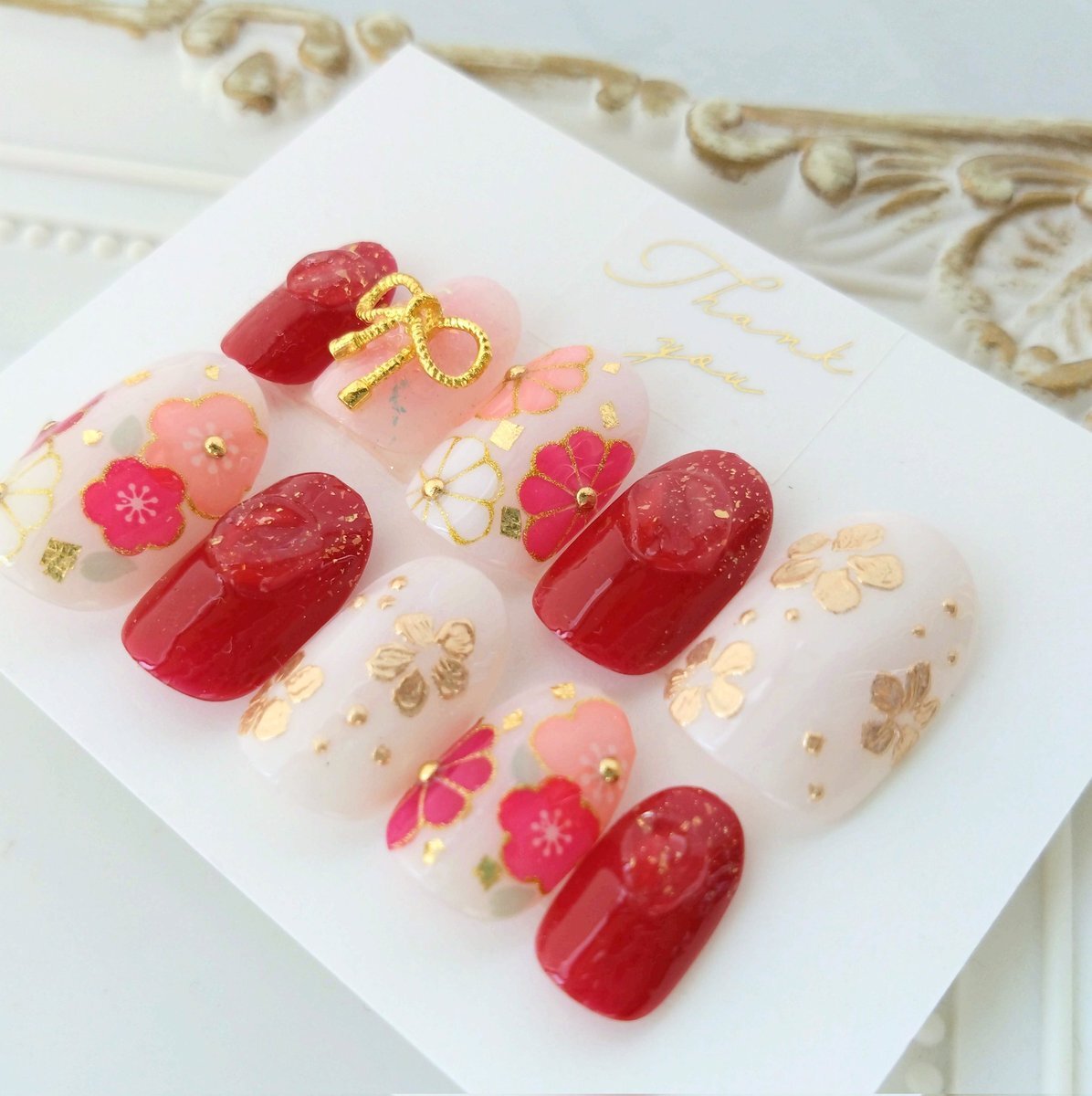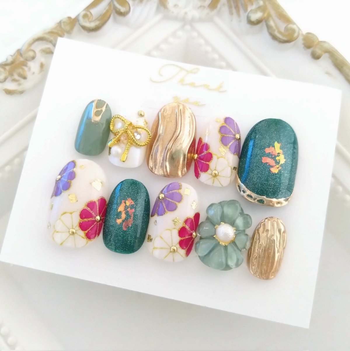 うるつやグリーンのマグネットジェルと赤と紫の菊模様の金うねうねと黄緑のぷっくりフラワーの和柄のネイルチップ◆63 creema.jp/item/16876893/… #振袖ネイル #成人式 #振袖 # #前撮り #色打掛 #プレ花嫁 #和柄ネイル #マグネットネイル #ネイルチップ #着物 #卒業式 pic.x.com/KRJWD86mMQ