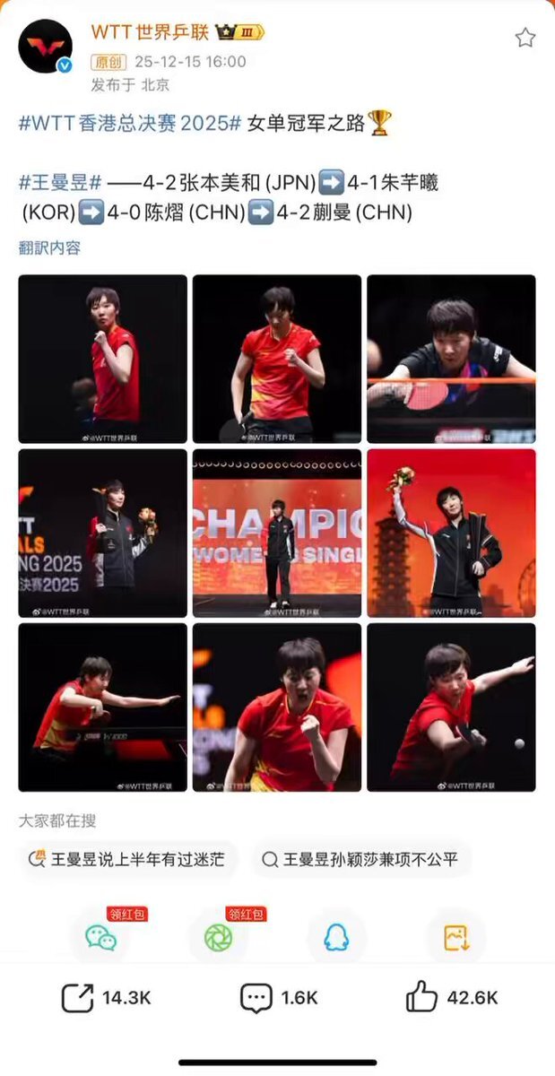 #WTT 王曼昱女单冠军之路下的评论区。刚结束的2025WTT总决赛因为自担运动员没得冠军且对赛事赛程安排不满,无端将怨气发泄在取得女单冠军王曼昱身上,次次赛后都这样有预谋有组织的编造、虚构事实,大规模网//暴、造//谣、辱//骂其他运动员,WTT官方账号也默认这种行为发生从不加已管理。