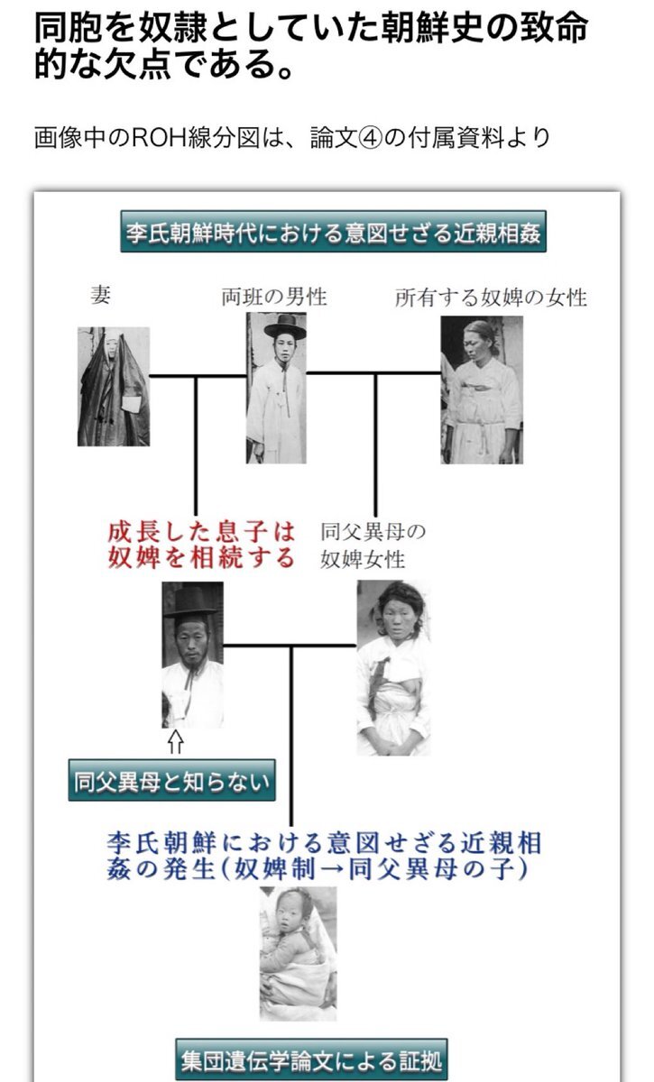 #意図せざる近親相姦・近親婚 #危険性 👇 朝鮮では同族内で奴隷制度があった為、両班の男性が奴隷の女性に産ませた子(子も奴隷であり、両班の所有となる)と妻に産ませた子が次の世代で腹違いの兄妹間で子を産ませると言うことを繰り返して来たという事なんですね🤔。 王家だけの話ではない。 pic.x.com/1qRr1wd1Id x.com/kaim85381826/s…