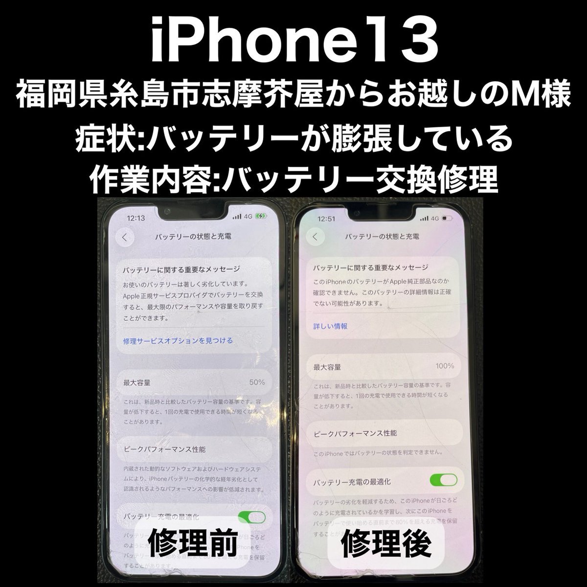 【iPhone修理】 iPhone修理 福岡県糸島市志摩芥屋からお越しのM様 機種:iPhone13 修理内容:バッテリー交換修理 作業時間:30分 #iPhone #毎朝9時オープン #学割 #iPhone13バッテリー交換修理 #バッテリー交換修理 #データそのまま #iPhone13 #即日修理 pic.x.com/wfyJA7GJLr