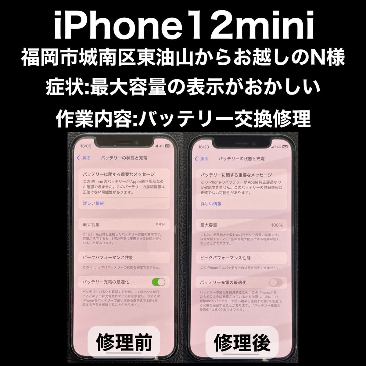 【iPhone修理】 iPhone修理 福岡市城南区東油山からお越しのN様 機種:iPhone12mini 修理内容:バッテリー交換修理 作業時間:30分 #iPhone #毎朝9時オープン #学割 #iPhone12miniバッテリー交換修理 #バッテリー交換修理 #データそのまま #iPhone12mini #即日修理 pic.x.com/ufgixP1eIO