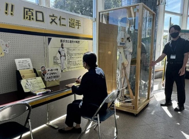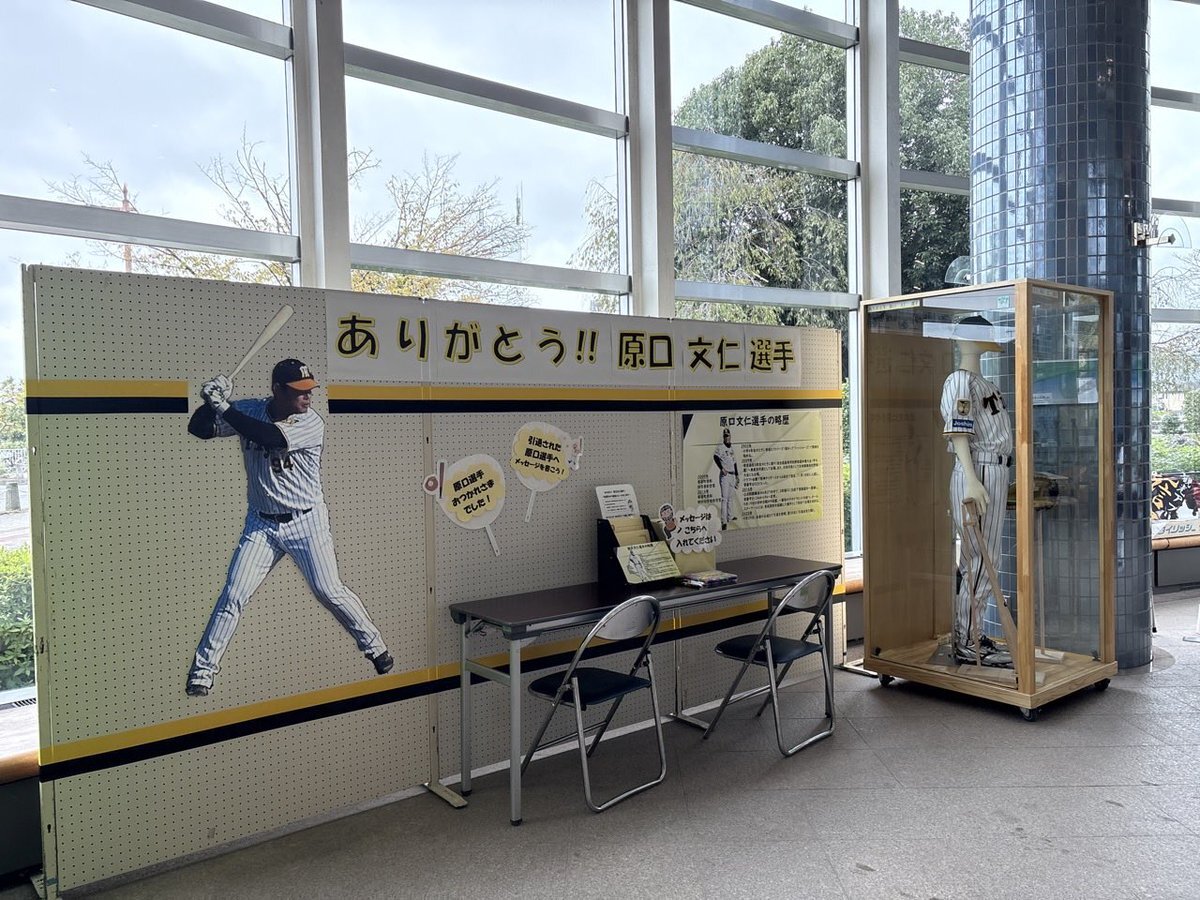 【阪神・原口文仁 引退で特設ブース】 埼玉県寄居町役場1階ロビーに開設された原口文仁選手の特設ブース。 展示品は、阪神が18年ぶりにリーグ優勝を果たした2023年シーズンのユニホームのほか、16年のオールスター戦で使用したグローブやバットなど。 #原口文仁 news.yahoo.co.jp/articles/d3ad7…