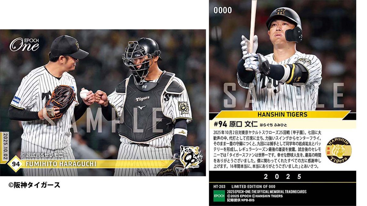 ■EPOCH-ONE■⚾️✨ #阪神タイガース#原口文仁】 引退試合&セレモニー 1枚¥500(送料無料) #メモリアルカード 10/18(土)18時までの限定受注販売開始! epoch-card.com/shop/r/r1010/ #エポックワン #tigers #阪神 #タイガース pic.x.com/p72W4jrW0P