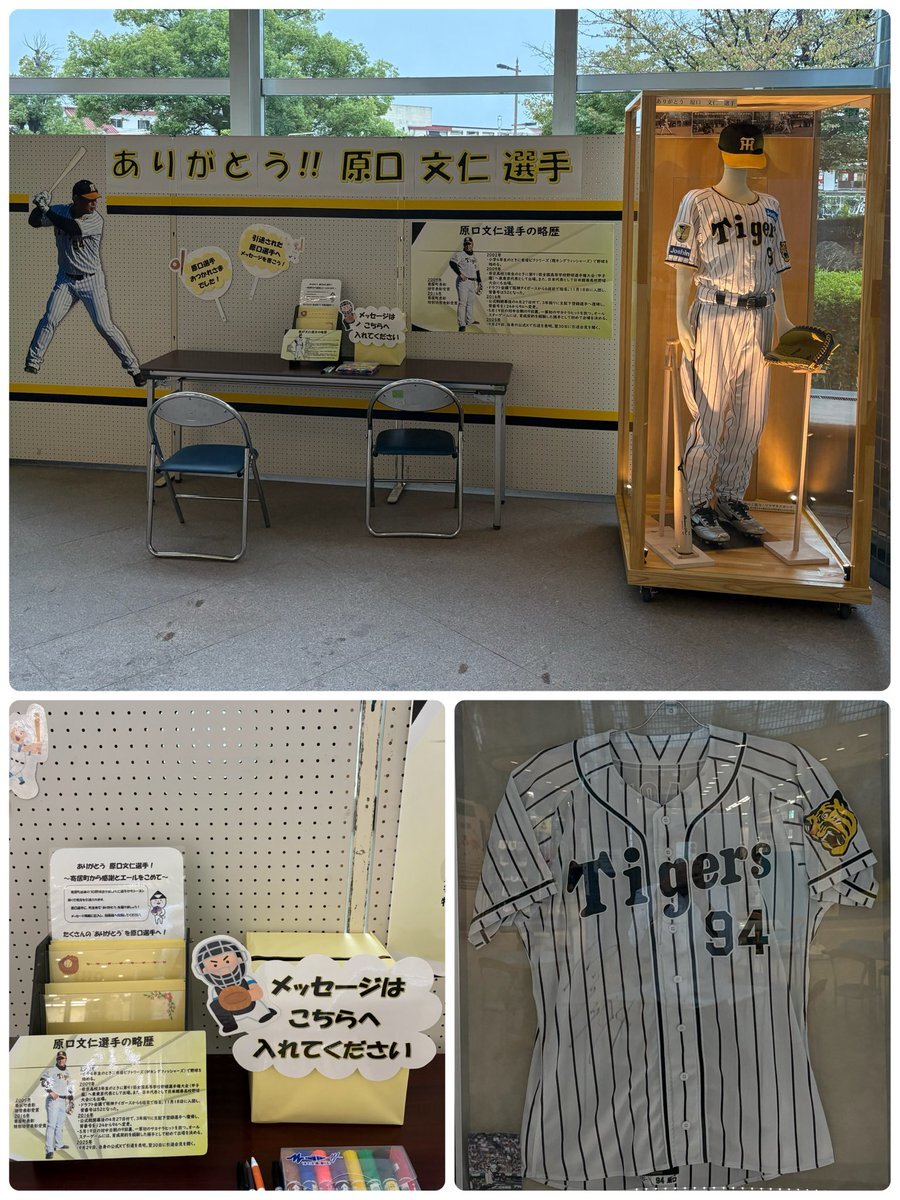 #プロ野球 #阪神タイガース 今季引退 #原口文仁 出身地 #埼玉県寄居町役場 に【ありがとう!  #原口 文仁選手】の特設ブース ユニホームや愛用グラブ等展示し町ゆかりのスターに感謝の気持ちを伝えようと来庁者からメッセージを募る 展示されているのは23年シーズンのユニホーム他16年 #オールスター pic.x.com/3MrzJOgUsY