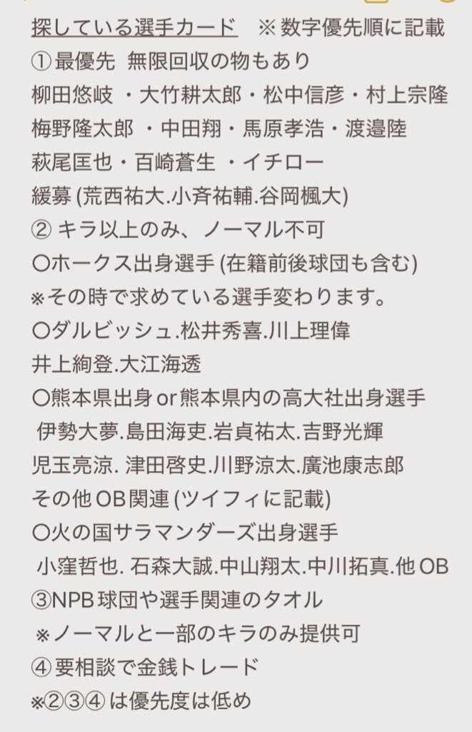 阪神タイガース.原口選手.エポック.トレード.BBM.topps.GENESIS 柳田悠岐.大竹耕太郎.松中信彦.梅野隆太郎.村上宗隆.百崎蒼生などを優先.3枚目リストの選手は要相談で交換お願いします。 #topps #タイガース #原口文仁 pic.x.com/QFFtGNPHjA