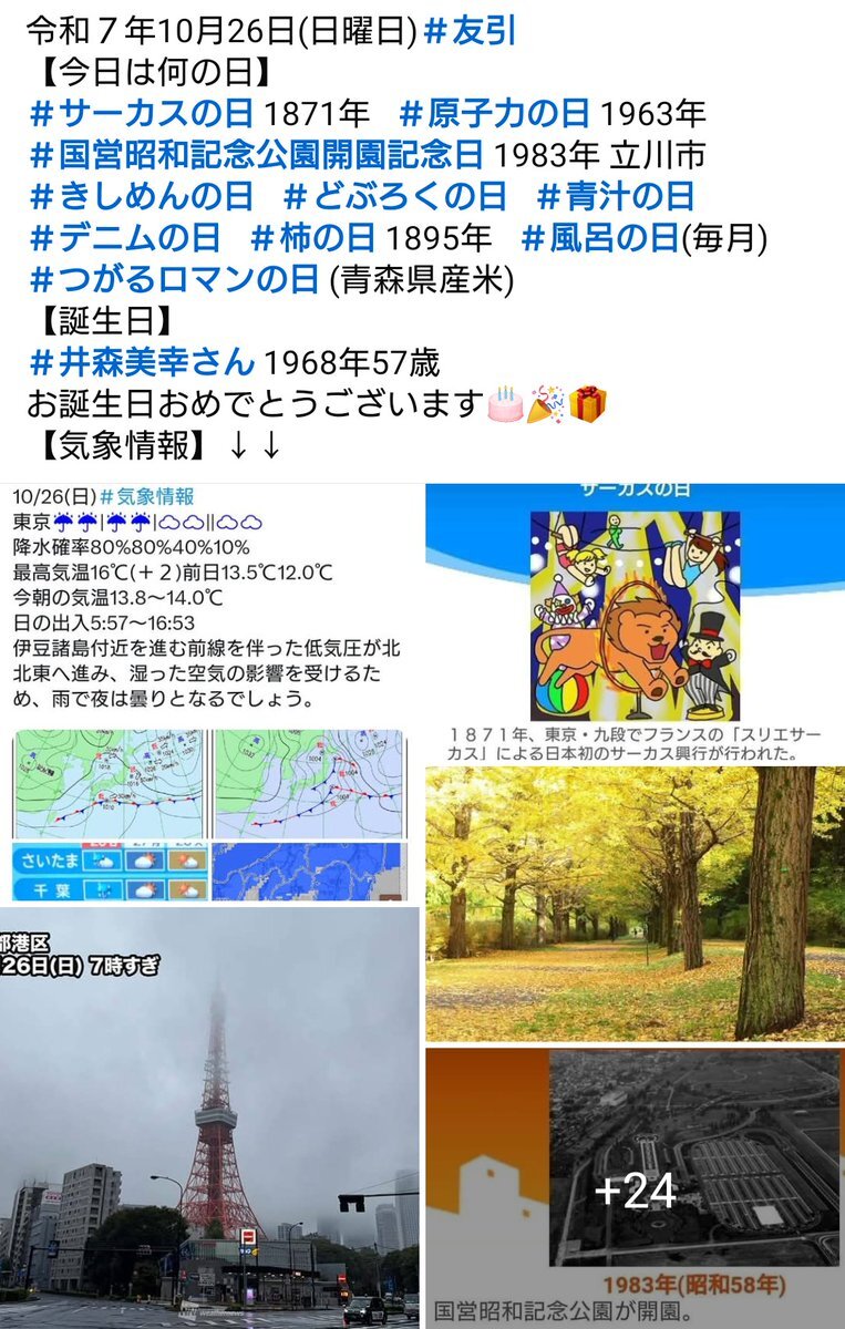 2025.10.26(日)#友引 #今日は何の日 サーカスの日/原子力の日/青汁の日 国営昭和記念公園開園記念日 きしめんの日/どぶろくの日 デニムの日/柿の日/風呂の日(毎月) つがるロマンの日(青森県産米) #誕生日 井森美幸 1968年57歳 🎂おめでとうございます🎉 pic.x.com/fj030akYFO