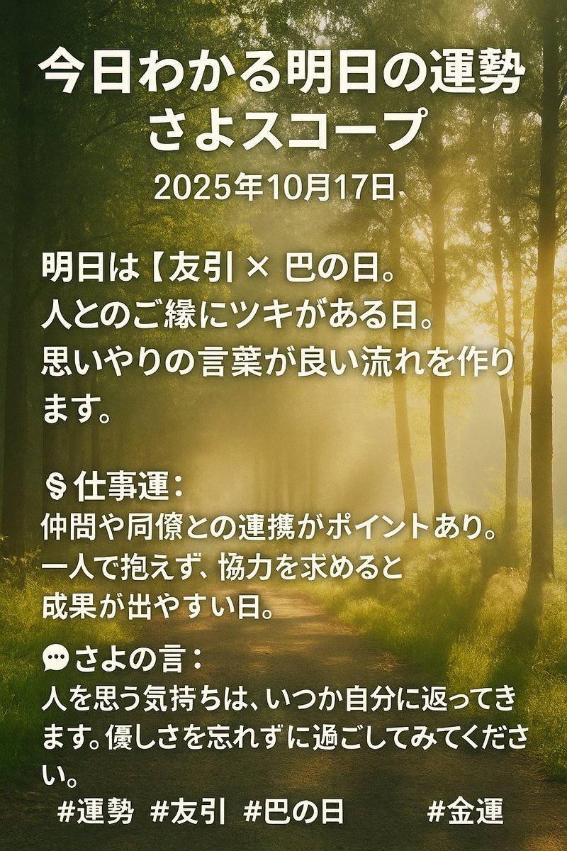 おはようございます 10月10日金曜日壬子友引 友引の日 朝夕夜は吉 午の刻(午前11時〜13時)のみ凶 素敵な金曜日を よい一日になりますように #金曜日 #友引 #石切占い pic.x.com/3Nurr66zzx