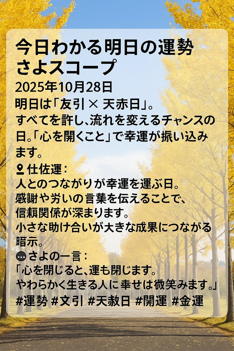 おはようございます 10月26日日曜日戊辰友引 友引の日 朝夕、夜は吉 ただし、午の刻(午前11時〜午後13時)のみ凶 よい日曜日を #日曜日 #友引 #石切占い pic.x.com/ds8GRIEa3Z