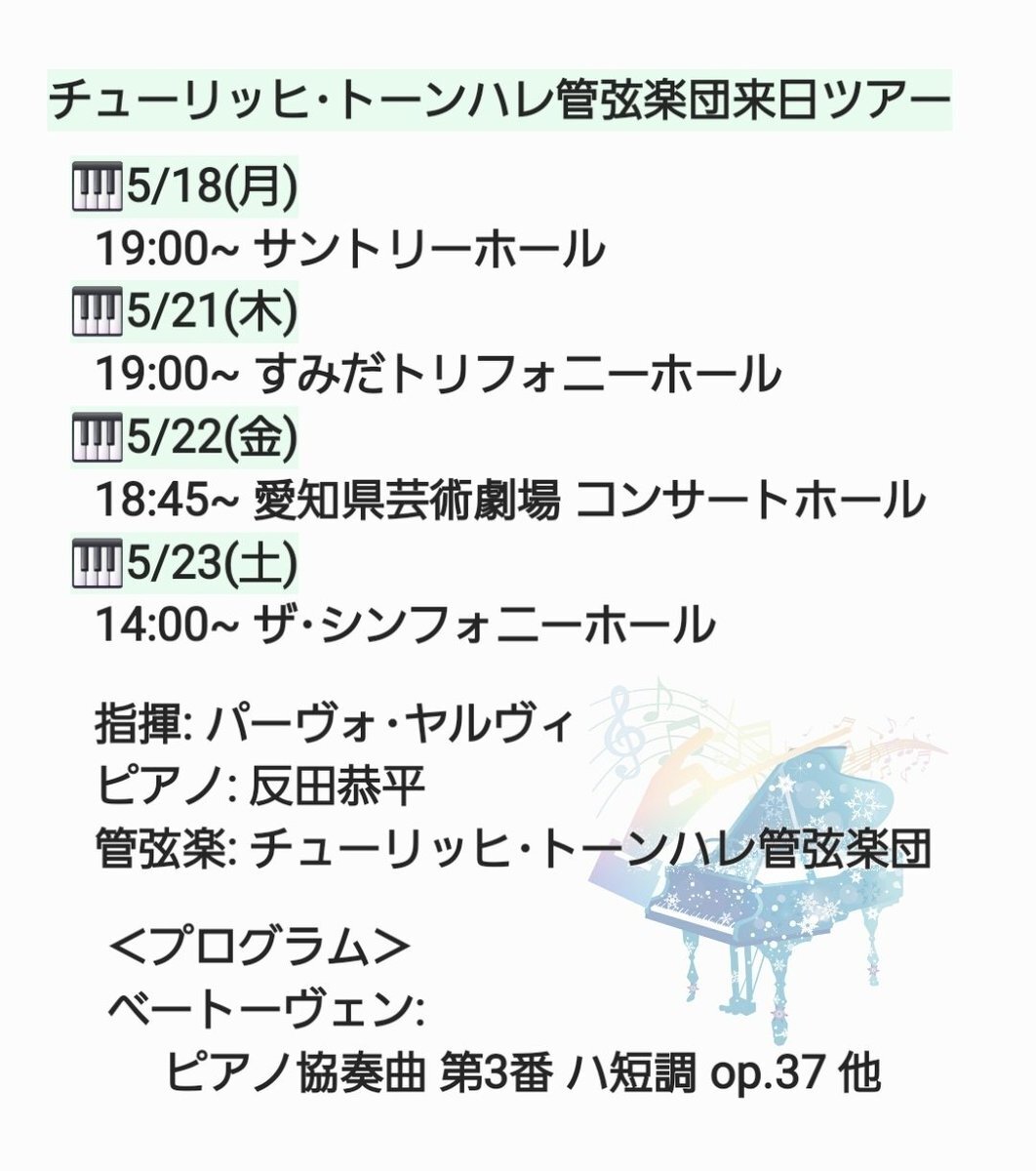【#反田恭平 #チューリッヒ・トーンハレ管弦楽団 #ベトP協3番】 チューリッヒ・トーンハレ管弦楽団の来日ツアー、反田さんのご出演は、東京2公演、愛知、大阪です。 🎫Solistiade先行先着 愛知11/20~26, 東京12/12~17 🎫Solistiade先行抽選 大阪11/27~11/30 <詳細> 🔗fan.pia.jp/solistiade/tic… pic.x.com/2kzRlkxkZ9