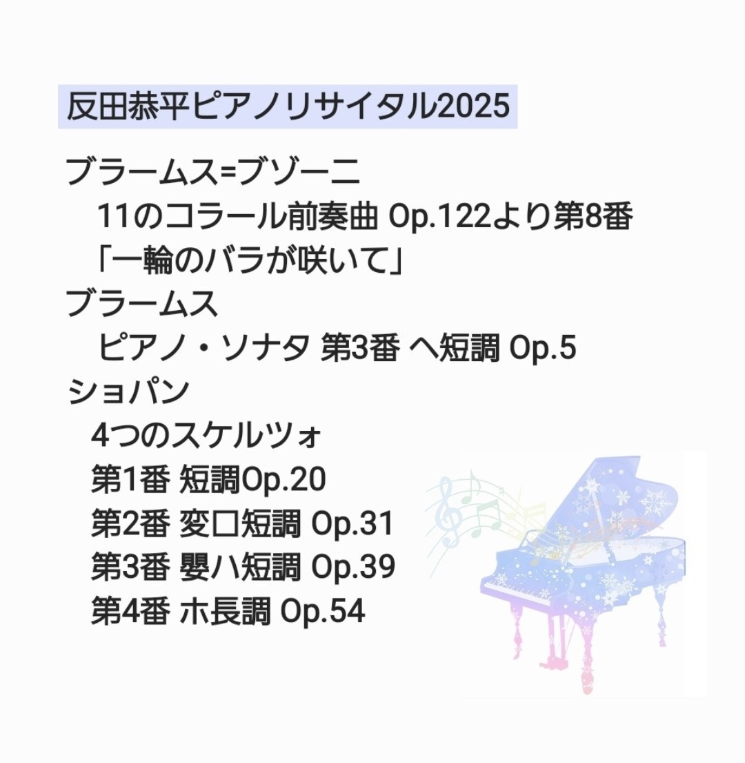 反田恭平ピアノリサイタル2025。🤭ブラームス=ブゾーニ:11のコラール前奏曲「一輪のバラが咲いて」、ブラームス:ピアノ・ソナタ 第3番 、ショパン:4つのスケルツォ第1番 第2番 第3番 第4番 でした🤭反田さんのショパン聴けて嬉しかったです😃素晴らしいピアノありがとうございました😃#反田恭平 pic.x.com/mDH68QF5Km