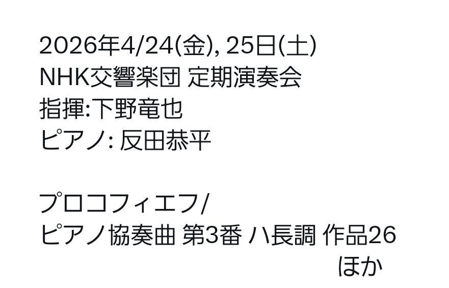 【#反田恭平 #N響 #プロコ3】 🎫定期会員先行発売日 2026年2/19(木)10:00~ 🎫一般発売日 2026年2/23(月・祝)10:00~ 詳細🔗nhkso.or.jp/concert/202604… pic.x.com/mPyYQUIvdW