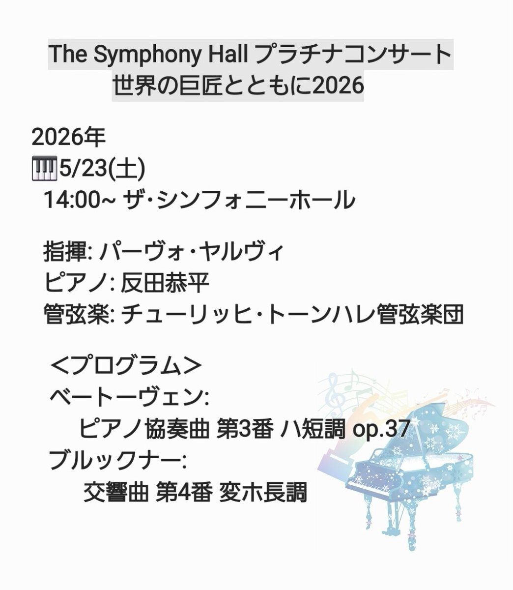 【速報‼️#反田恭平 ベトP協3番】 こちら、東京公演ありました! 2026年 5/18(月)19:00~ サントリーホール (引用の公演と同プログラム) x.com/sususu_chan/st…