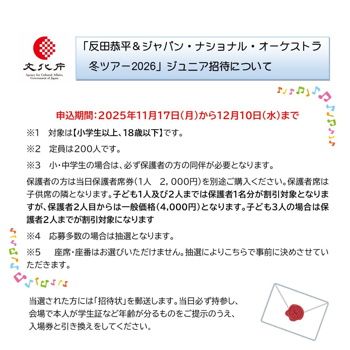 【今日から申込受付開始!!】 「#反田恭平& #JNO 冬ツアー2026」へ文化庁「子供舞台芸術鑑賞体験支援事業」として、小学生以上18歳以下のお子様を無料招待します🎹⛄ ぜひご応募ください♪ 詳細は画像をチェック👀 申込フォームはこちら👉 city.fukuyama.hiroshima.jp/ques/questionn… pic.x.com/XWKreT6xS8