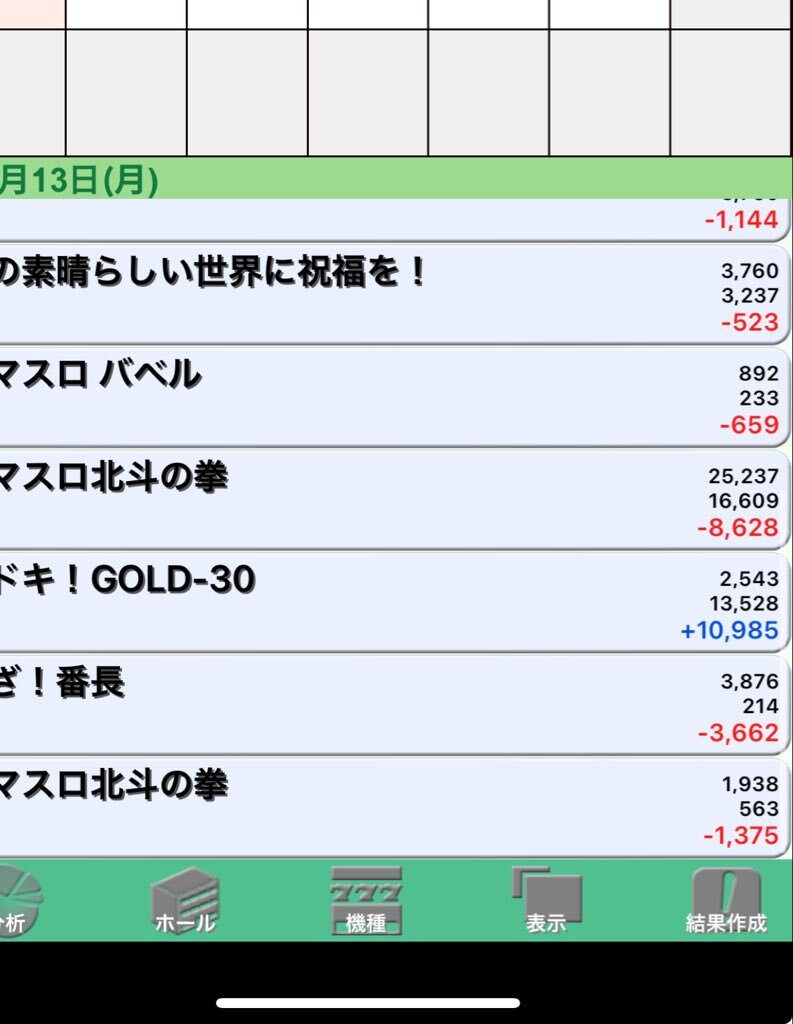 令和7年10月13日 稼働:11台(1勝10敗)勝率9.09% 稼働時間:5時間40分 今日は序盤からずっと流れ悪く、唯一のプラスが沖ドキ🌺 他は全部マイナスで久々に心折れそうな展開🥲 #パチスロ #収支報告 #北斗の拳 #ラブ嬢3 #チバリヨ #沖ドキGOLD #番長 #麻雀格闘倶楽部 #このすば pic.x.com/JVwe7z65BT