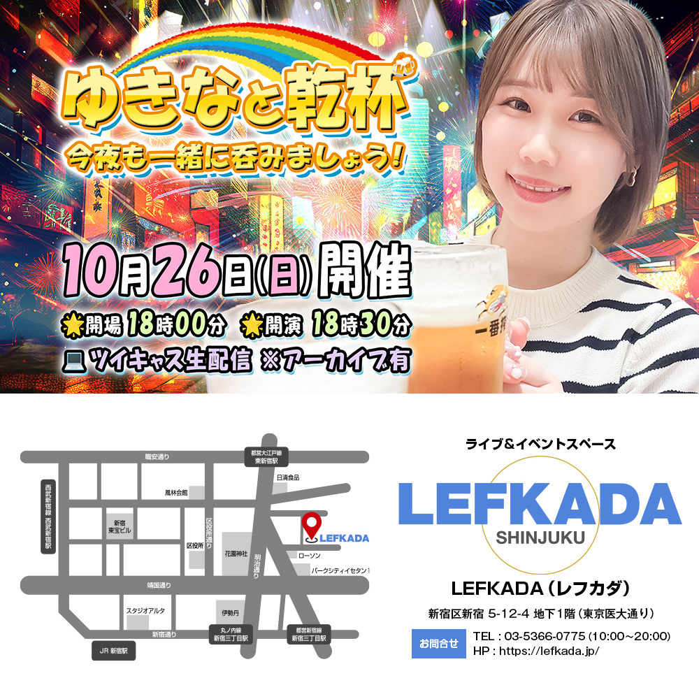 #拡散希望 #イベント #受付中 🗓10/26(日) 18時30分 開演 🍻ゆきなと乾杯 vol.7 🧚‍♀️出演 ゆきな @yukinamatsu03 🎟️来場予約 tiget.net/events/434638 ✅遠隔応援 受付は前日23時59分〆 t.livepocket.jp/e/wyev3 💻生配信 premier.twitcasting.tv/lefkada_jp/sho… #レフカダ #新宿 #呑みましょう #ゆきな飯 pic.x.com/1FCsYp7U3y