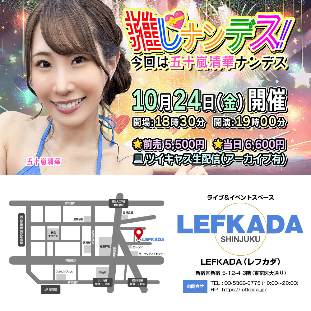 #拡散希望 #イベント #受付中 🗓10/24(金) ⌚18:30 開場 ⌚19:00 開演 🍻推しナンデス!vol.4 🧚‍♀️出演 五十嵐清華 石垣進行 🎟️来場予約 tiget.net/events/434732 ✅遠隔応援 受付は前日23時59分〆 t.livepocket.jp/e/fdnm7 💻生配信 premier.twitcasting.tv/c:lefkada_2nd/… #レフカダ #3F会場 #新宿 #推し活 pic.x.com/NK2MwXB85P