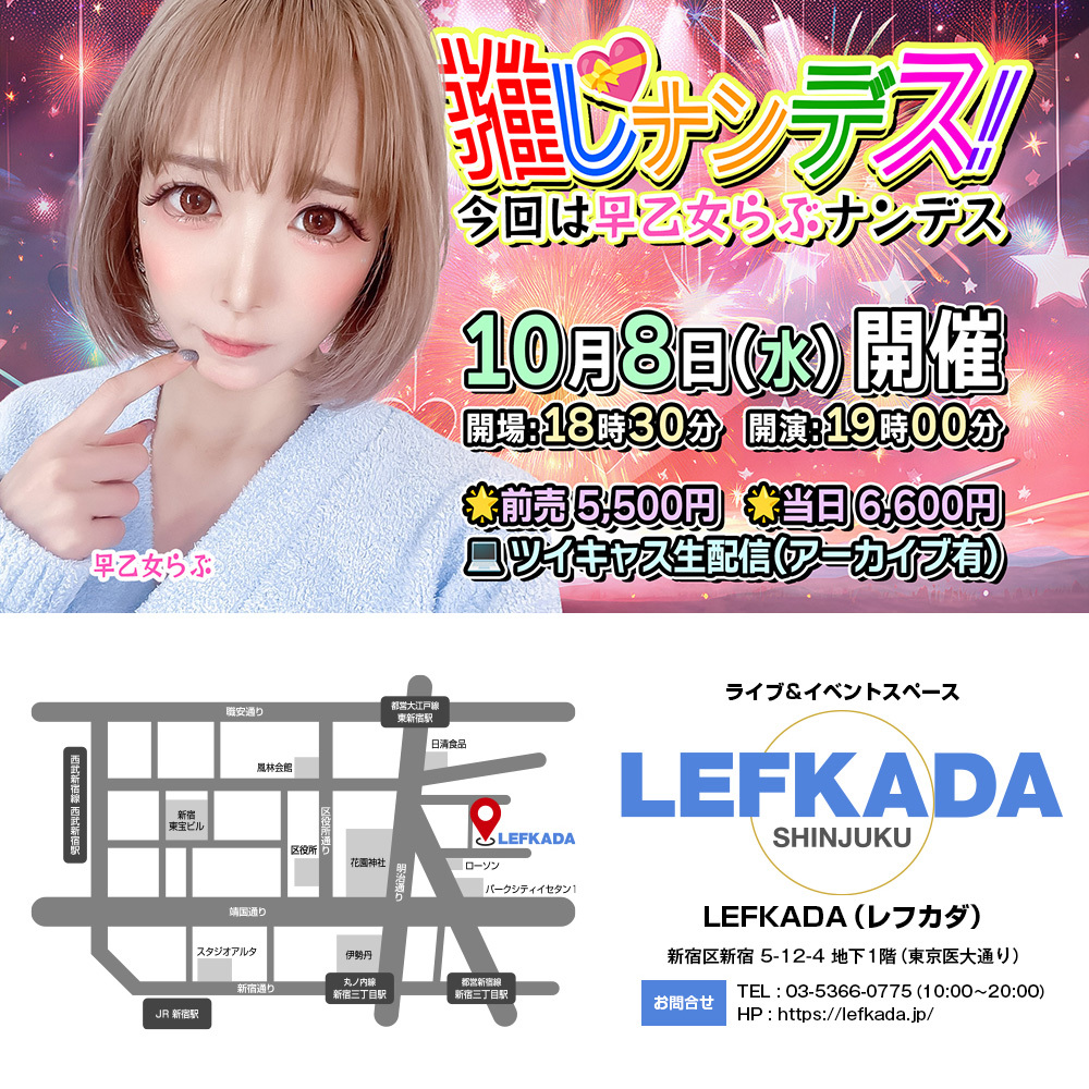 #拡散希望 #イベント #受付中 #明日 🗓10/8(水) ⌚18:30 開場 ⌚19:00 開演 🍻推しナンデス!vol.3 🧚‍♀️出演 早乙女らぶ 石垣進行 🎟️来場予約 tiget.net/events/431419 ✅遠隔応援 受付は本日23時59分〆 t.livepocket.jp/e/6ngl_ 💻生配信 premier.twitcasting.tv/lefkada_jp/sho… #レフカダ #新宿 #推し活 pic.x.com/FxKj74m1Ov