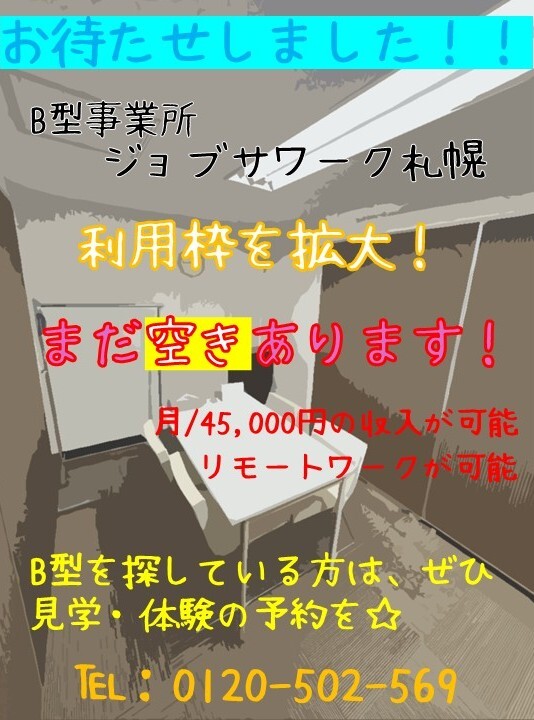 お知らせです👏 満員だったB型事業所の「ジョブサワーク札幌」がついに利用者増員を決定しましたー🎉👏 というわけで、現在利用者募集中です🤩 見学・体験も随時可能😆 ご希望の方はお早めに!⇒📞0120502569まで👍 #就労継続支援 #ジョブサワーク #札幌 #sapporo #B型 #福祉 #募集中 #受付中 #着色 pic.x.com/awBzvGrxG8