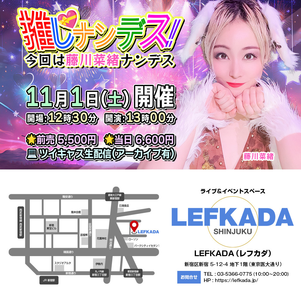 #拡散希望 #イベント #受付中 🗓11/1(土) ⌚12:30 開場 ⌚13:00 開演 🍻推しナンデス!vol.5 🧚‍♀️出演 藤川菜緒 石垣進行 🎟️来場予約 tiget.net/events/435825 ✅遠隔応援 受付は前日23時59分〆 t.livepocket.jp/e/5flr0 💻生配信 premier.twitcasting.tv/lefkada_jp/sho… #レフカダ #新宿 #推し活 pic.x.com/mdIs8DB0Gz