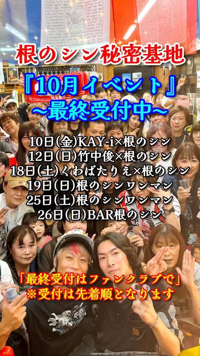 【最終受付中】 『秘密基地10月イベント』 10日(金)KAY-i×根のシン 12日(日)竹中俊×根のシン 18日(土)くわばたりえ×根のシン 19日(日)根のシンワンマン 25日(土)根のシンワンマン 26日(日)BAR根のシン community.camp-fire.jp/projects/view/… ※受付は先着順となります #kayi #竹中俊 #くわばたりえ #右手左手