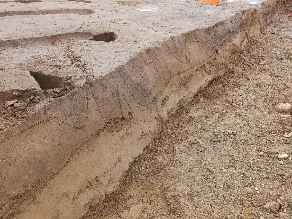 六日町藤塚遺跡の現場情報 壁面の層序に線を引いたところ、古代の建物の柱穴、竪穴状の土坑があるのがわかりました。これから地表面を清掃してたくさん遺構を見つけていきます。 #発掘調査 #遺構 #古代 pic.x.com/vtHpnESIjn