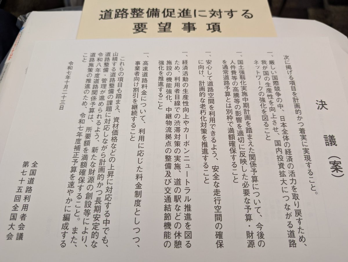 全国道路利用者会議の全国大会が福井市で開催。「道路は人、物、金、思想を運んできた」との話がありましたが、まさに。移動のネットワーク構築が多様な人材の交差を可能にし、様々な価値を生み出してきた。 福岡県からも多くの首長が参加。国に道路整備促進を求める決議を採択しました。 #古賀市 pic.x.com/qL0MslGIly x.com/tanabe_kazuki/…