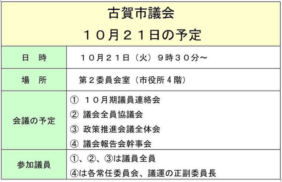 10月21日は議員連絡会や議会全員協議会、政策推進会議全体会、議会報告会幹事会が開かれます。定例議会がない時も各種会議が行われています。 #古賀市 #ぬま健司 #議員連絡会 #閉会中の議会活動 pic.x.com/GdzHthCCE2