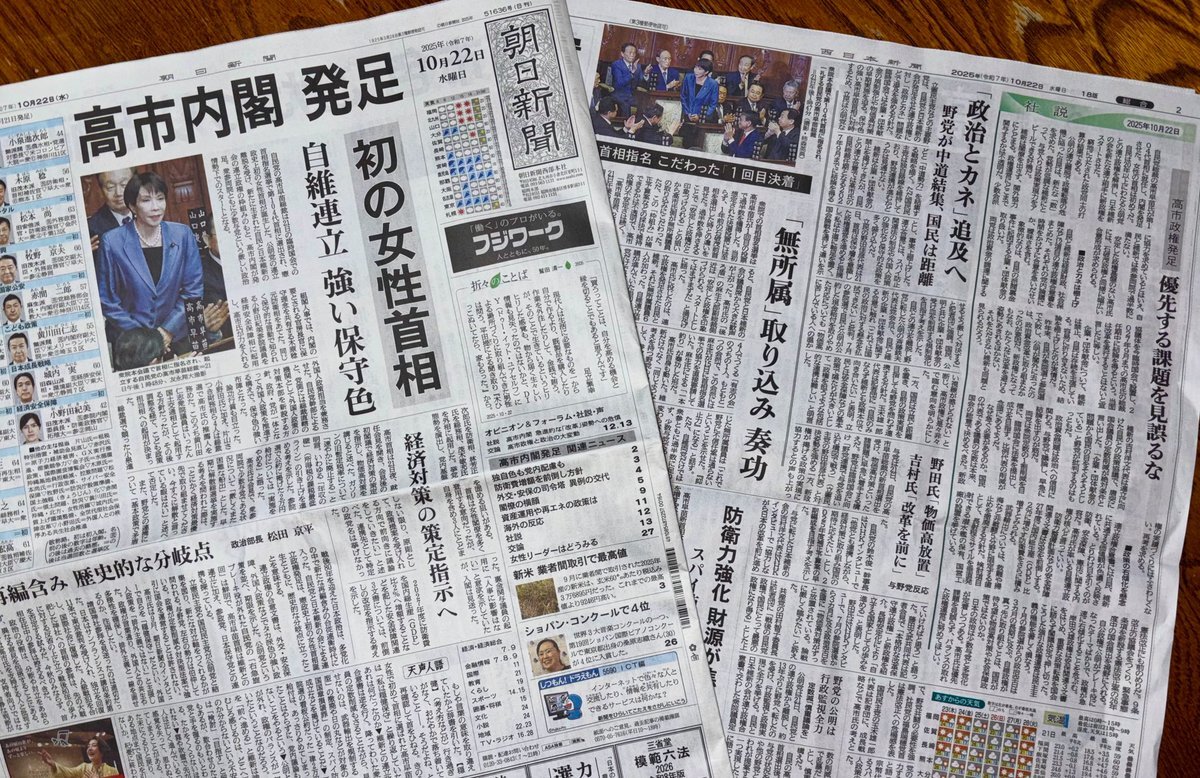 10月21日、自民党の高市早苗総裁が首相に選出され自維連立政権が発足。「積極財政・物価高対策へ」、「強い保守色、再編含み、歴史的な分岐点」、「問われる野党」等の指摘も。大きな政治的荒波を、地方政治の進化・成長の好機とするかどうかも問われてきます。 #古賀市 #ぬま健司 #高市自維連立政権 pic.x.com/KGNAvBp4bO